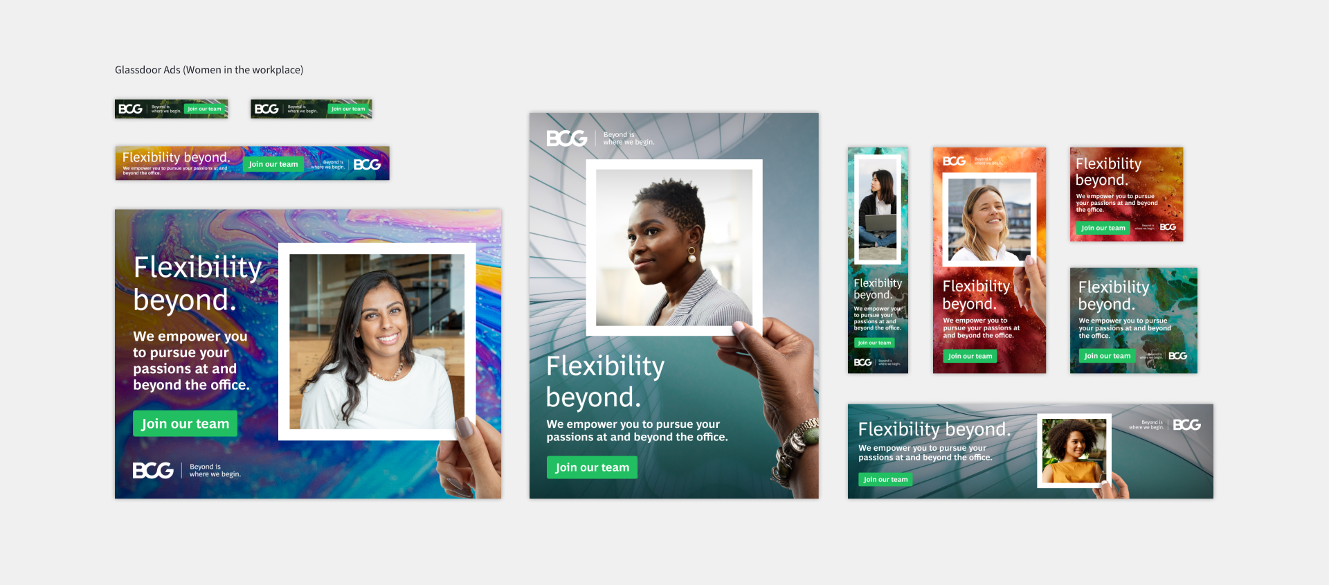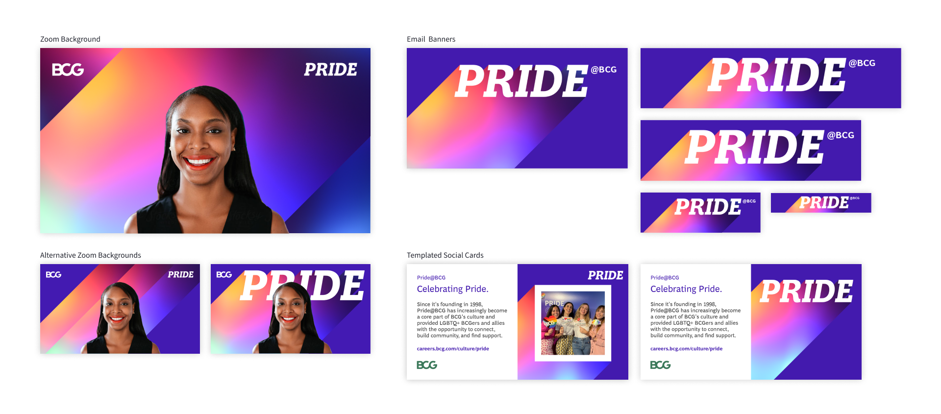 We designed a variety of templates for campaigns, emails, social media posts, paid ads, and grab-and-go/ready-made assets. Most recently we had a lot of fun designing BCG’s 2024 Pride assets.